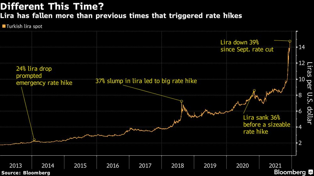 A onda de vendas que tornou a lira a moeda de pior desempenho mundial se acelerou depois que o presidente da Turquia, Recep Tayyip Erdogan, reforçou sua convicção pouco ortodoxa de que taxas de juros mais altas alimentam a inflação e devem ser evitadas. Em pesquisa da Bloomberg, 12 investidores turcos e estrangeiros indicaram que perderam a esperança de que Erdogan deixará de interferir na política monetária.