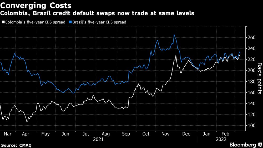 Os títulos denominados em dólar da Colômbia são negociados com rendimentos acima dos exigidos para a dívida externa brasileira, que tem nota de risco mais baixa. O candidato de esquerda Gustavo Petro lidera as pesquisas de intenção de voto para a eleição presidencial de maio. No caso do Brasil, os investidores parecem ter aceitado a perspectiva de retorno do ex-presidente Luiz Inácio Lula da Silva ao poder nas eleições de outubro.