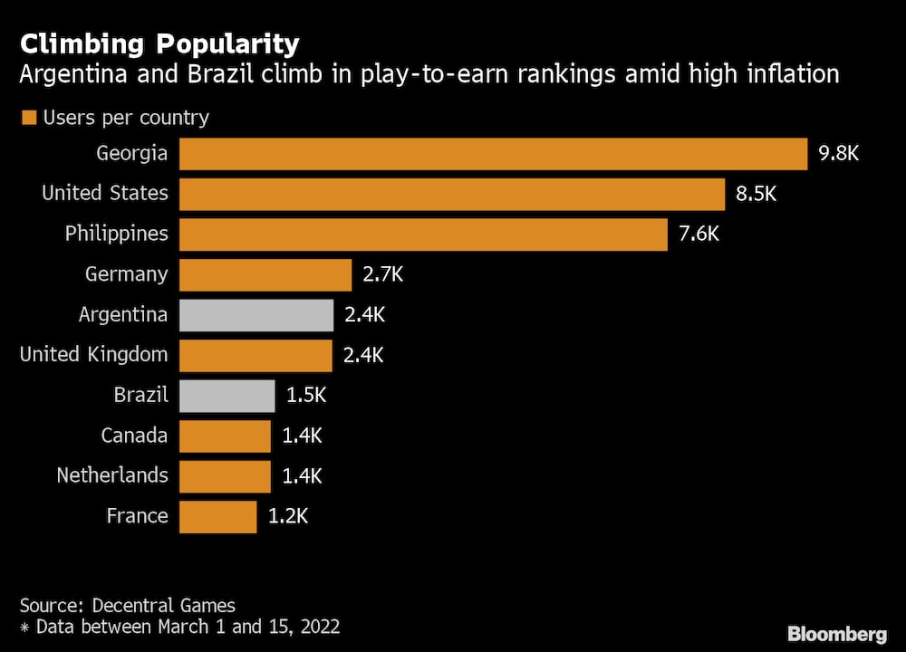Argentina, Brasil e Venezuela são os países latino-americanos com o maior número de usuários na plataforma Axie Infinity, na qual jogadores ganham tokens quando vencem batalhas. Os latino-americanos em geral não têm dinheiro para abrir a própria conta e participam usando um tipo de conta que permite que joguem em nome de americanos, explicou Mauricio Ramos, responsável pela América Latina na Axie.