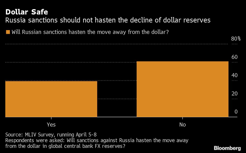 A maioria dos entrevistados diz que as sanções à Rússia, que incluíram o congelamento de suas reservas cambiais, não vão acelerar o uso de outras moedas como reserva global de bancos centrais. Isso apesar de avisos do Fundo Monetário Internacional e outros sobre o declínio do domínio do dólar.