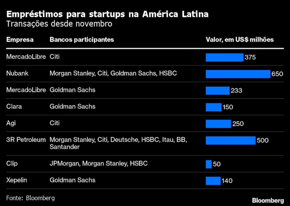 Bloomberg — Bancos como Goldman Sachs (GS) e Citigroup (C) estão elevando o volume de crédito concedido para startups latino-americanas, uma vez que a queda no valor das ações dessas empresas torna a venda de fatias do capital menos atraente.
