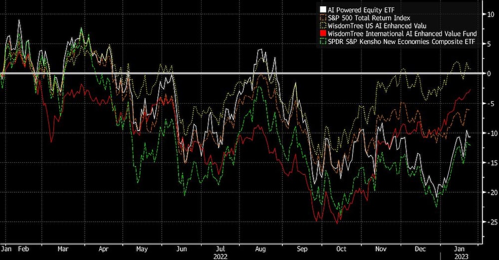 Um destaque atual é o AI Powered Equity ETF (AIEQ), um veículo de US$ 102 milhões que retornou cerca de 9,9% em 2023 até o dia 25, comparado com 4,7% para o Índice de Retorno Total S&P 500.