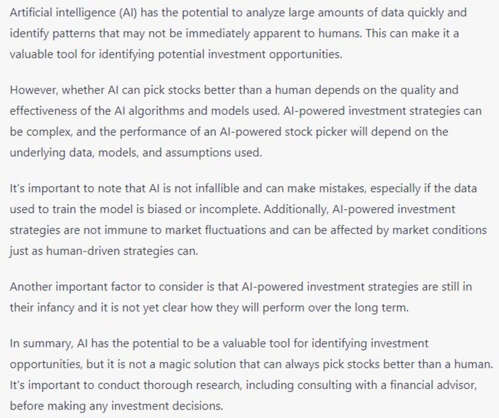 A inteligência artificial consegue analisar grandes quantidades de dados rapidamente e identificar padrões que podem não ser imediatamente aparentes para os seres humanos. Isto pode torná-la uma ferramenta valiosa para identificar possíveis oportunidades de investimento. Contudo, se a IA pode escolher ações melhor do que um humano, isso depende da qualidade e eficácia dos algoritmos e modelos utilizados. As estratégias de investimento alimentadas por IA podem ser complexas, e o desempenho de um seletor baseado em IA  dependerá dos dados, modelos e suposições utilizados. É importante observar que a IA não é infalível e pode cometer erros, principalmente se os dados usados para treinar o modelo forem tendenciosos ou incompletos. Além disso, as estratégias de investimento alimentado por IA não são imunes às flutuações do mercado e podem ser afetadas pelas condições de mercado assim como as estratégias de humanos. Outro fator importante a ser considerado é que as estratégias de investimento alimentado por IA ainda são recentes e ainda não está claro como eles irão se comportar no longo prazo. Em suma, a IA tem o potencial de ser uma ferramenta valiosa para identificar oportunidades de investimento, mas não é uma solução mágica que consegue escolher ações melhor que um humano. É importante fazer uma pesquisa minuciosa, incluindo falar com um consultor financeiro, antes de tomar qualquer decisão de investimento.
