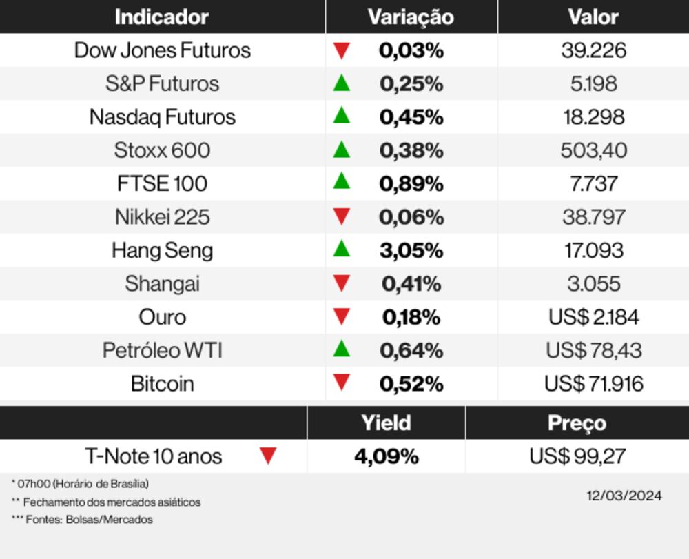 🔘 As bolsas ontem (11/03): Dow Jones Industrials (+0,12%), S&P 500 (-0,10%), Nasdaq Composite (-0,41%), Stoxx 600 (-0,35%), Ibovespa (-0,75%)
