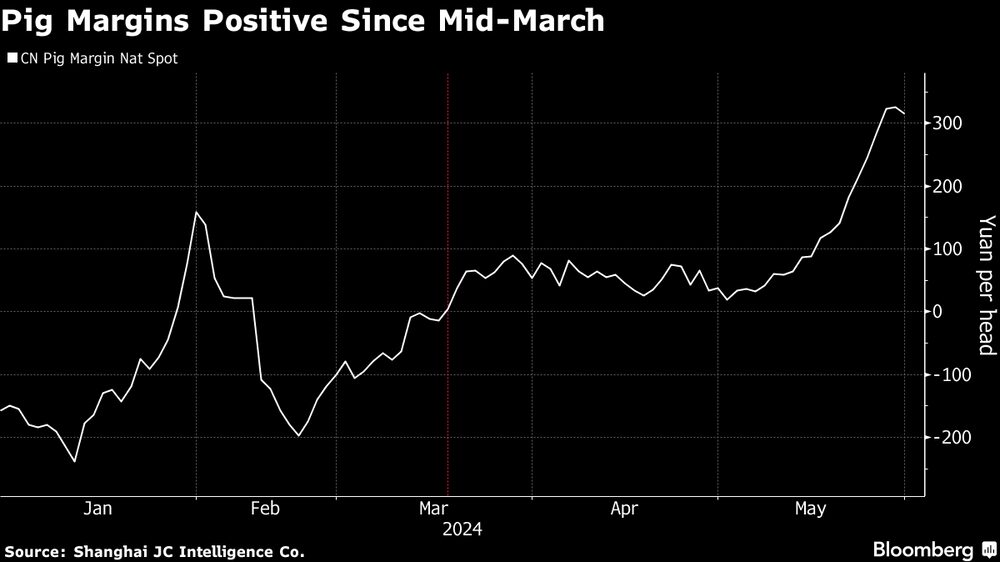 Os preços dos suínos subiram para o nível mais alto desde o final de 2022, impulsionados por um declínio na produção. As restrições na oferta, além de uma queda nos custos de ração, alimentaram um salto semelhante nas margens.