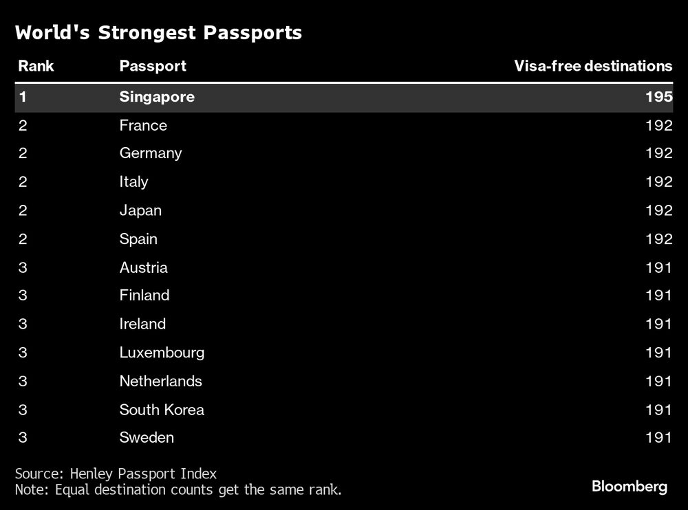 Apresentar um passaporte de Singapura significa entrada sem visto em um número recorde de 195 destinos globais, do Henley Passport Index. Os quatro países europeus acima citados, que ocuparam o primeiro lugar no início do ano, estão agora em segundo lugar, juntamente com o Japão.