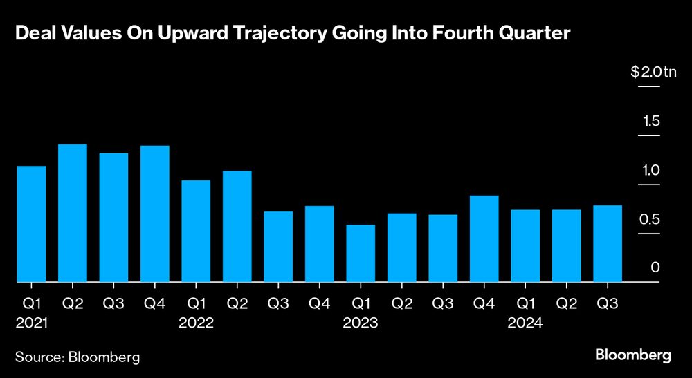 O valor somado de negócios em todo o mundo aumentou cerca de 16% em 2024 até o terceiro trimestre, chegando a US$ 2,3 trilhões, segundo os dados da Bloomberg.