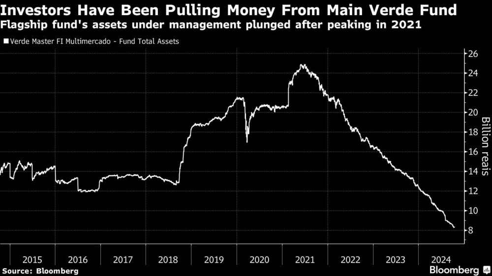 No seu auge, em 2021, a Verde Asset tinha R$ 55 bilhões sob gestão. O fundo Verde, que, grosso modo, representava metade dos ativos totais da gestora, registrou apenas a segunda queda anual de sua história naquele ano, e as saídas começaram a partir daí.