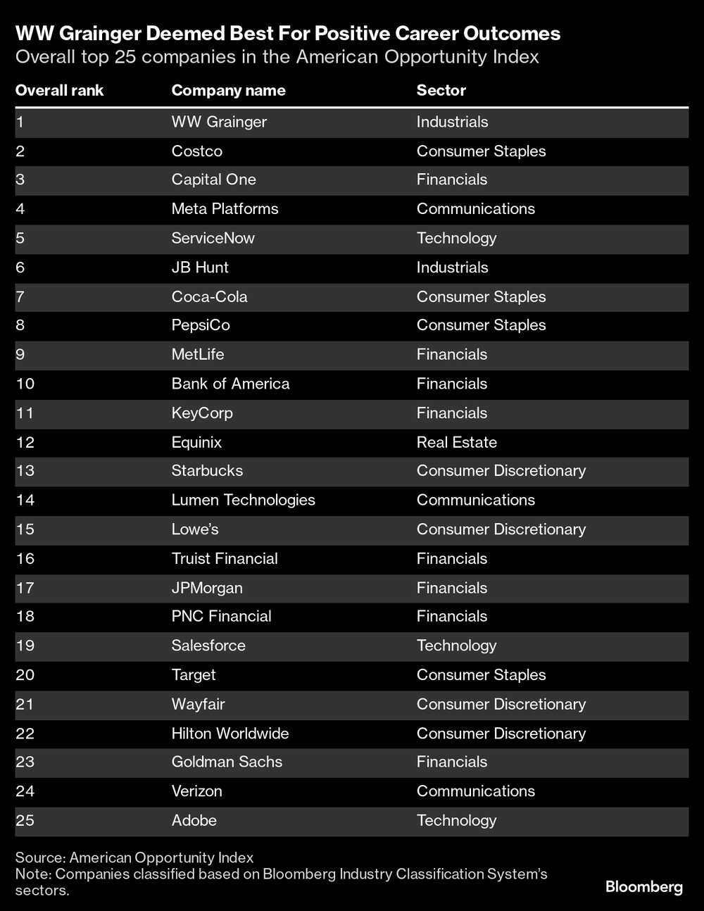 Juntamente com a Grainger, a lista das 25 maiores empresas deste ano é composta por empregadores modestos, mas estáveis, como a varejista Costco, a caminhoneira JB Hunt, o banco regional KeyCorp, a seguradora MetLife e a hoteleira Hilton.