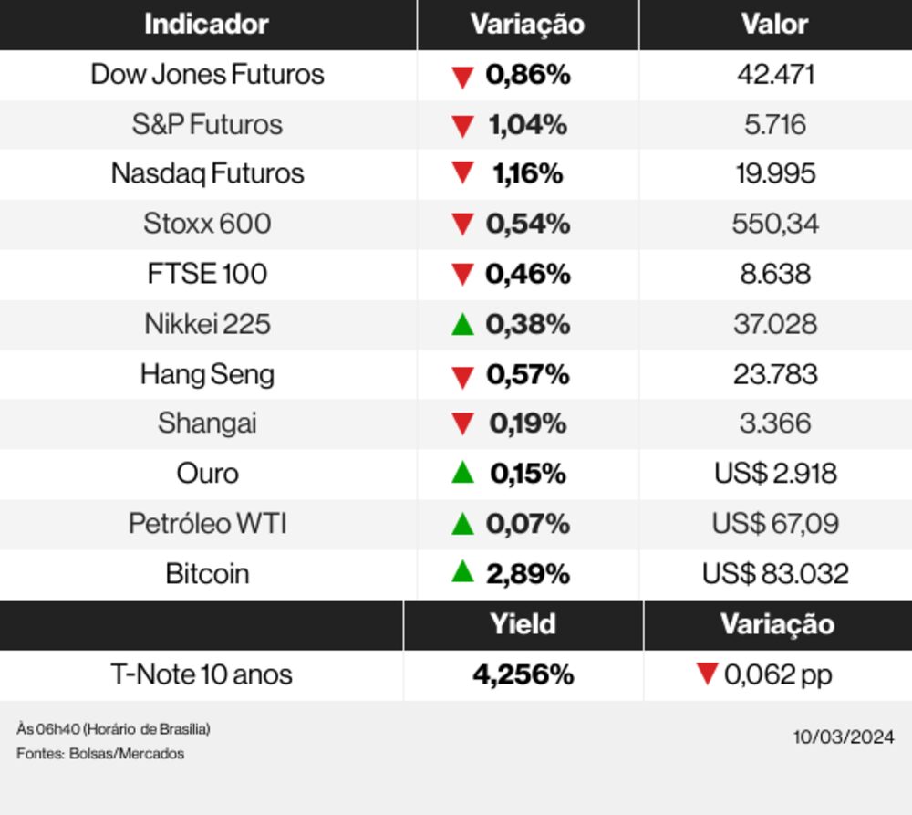 Os futuros de ações dos EUA operam em queda e os títulos do Tesouro sobem nesta segunda-feira (10), à medida que preocupações sobre a saúde da economia americana reduziram o apetite dos investidores por risco.