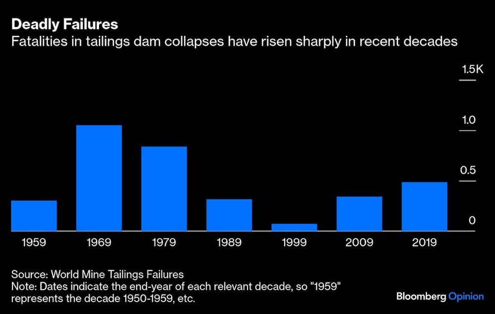 O colapso de barragens e pilhas de rejeitos pode soterrar trabalhadores, liberar substâncias tóxicas em rios e bloquear o acesso a depósitos valiosos.