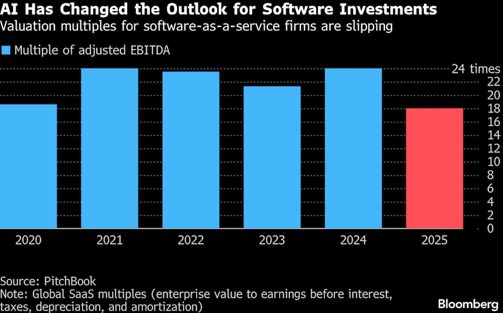Entre 2015 e 2025, mais de 1.900 empresas de software foram adquiridas por compradores de private equity em operações avaliadas em mais de US$ 440 bilhões, segundo dados compilados pela Bloomberg.