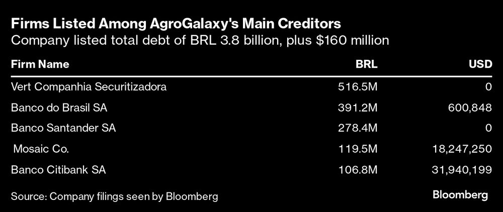A AgroGalaxy listou dívidas de cerca de R$ 3,8 bilhões em moeda local e outros US$ 160 milhões, de acordo com documentos vistos pela Bloomberg.