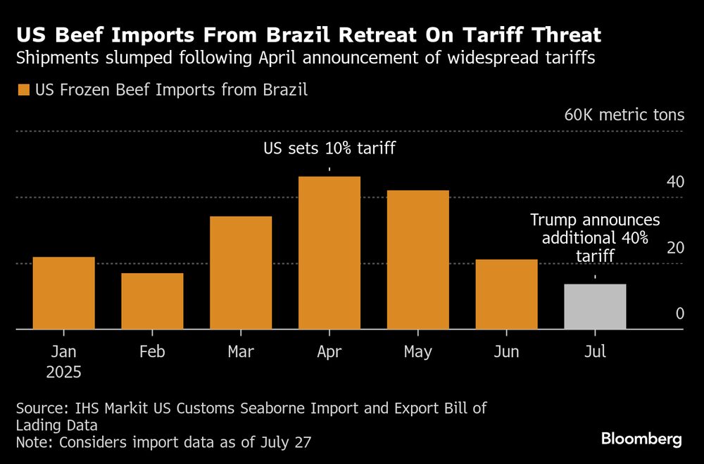 A ordem executiva de Trump continha algumas isenções significativas, incluindo o suco de laranja. Ainda assim, a carne bovina e o café do maior exportador do mundo continuam na lista de commodities que estarão sujeitas a tarifas de importação.