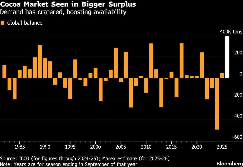 A demanda em queda, juntamente com a melhoria da produção, fez com que o mercado se corrigisse rapidamente. A corretora de commodities Marex Group estima um superávit global de 400.000 toneladas na atual temporada, o que seria o maior nos dados da Organização Internacional do Cacau desde a década de 1980.