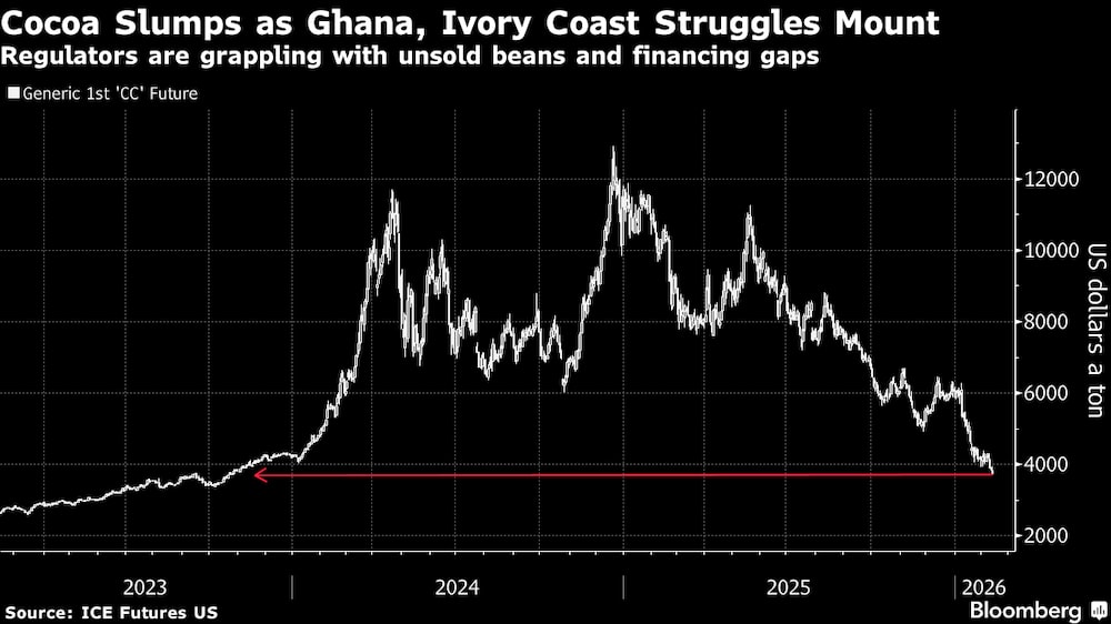 Os futuros do cacau em Nova York caíram quase pela metade desde o início da temporada 2025-26 em outubro, logo após os preços fixados pelo estado na África Ocidental terem acompanhado a alta. Atualmente, eles oscilam em torno de US$ 4.000.