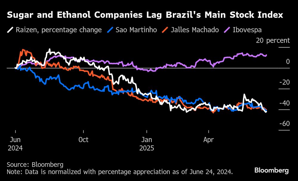 No entanto, a São Martinho e as rivais de capital aberto Raízen e Jalles Machado viram o valor de suas ações cair cerca de 40% no último ano. Embora o declínio da Raízen reflita, em parte, as preocupações com os níveis de endividamento da empresa, as ações do setor de açúcar e etanol como um todo tiveram um desempenho inferior ao do índice Ibovespa.
