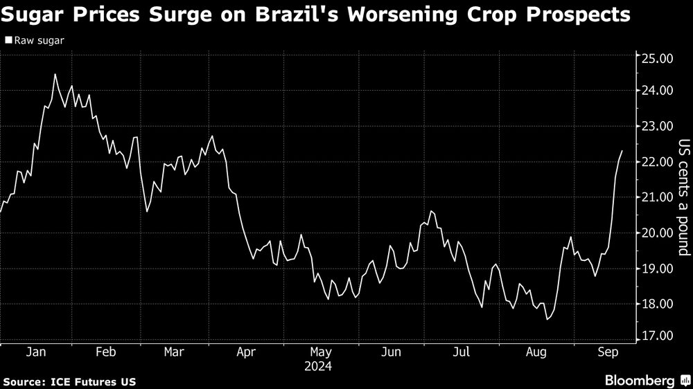 Os preços futuros do açúcar atingiram o valor mais alto desde fevereiro nesta semana, à medida que aumentam os temores sobre os danos às safras causados pelas queimadas, pelo calor e pela seca no Brasil, principal produtor e exportador.