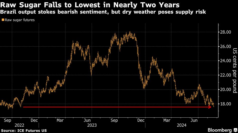 Bloomberg — O preço do açúcar bruto caiu para o nível mais baixo em quase dois anos devido ao sentimento de baixa, à medida em que os traders avaliam a oferta do Brasil, o maior produtor mundial.