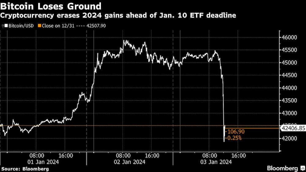 O bitcoin tem tido um desempenho excelente antes do prazo iminente de 10 de janeiro, que poderia levar a Comissão de Valores Mobiliários dos Estados Unidos (SEC, na sigla em inglês) a aprovar o primeiro fundo negociado em bolsa diretamente vinculado ao preço à vista do ativo. O valor da criptomoeda subiu quase 160% em 2023, acompanhando um aumento geral na fortuna dos ativos digitais.