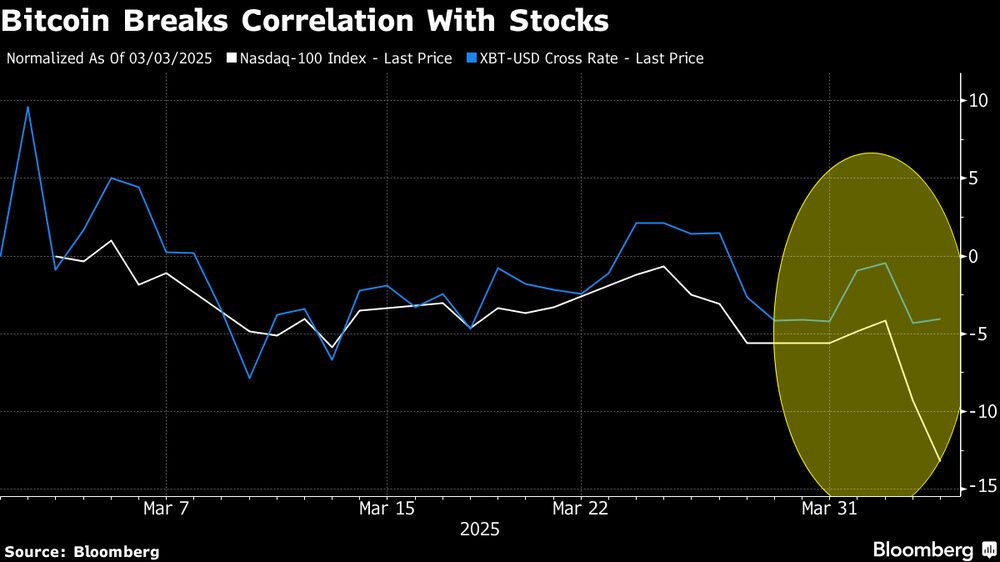 Bloomberg — O bitcoin está mostrando sinais de estar se libertando da atração gravitacional das ações de tecnologia durante a turbulência do mercado financeiro nos últimos dias.