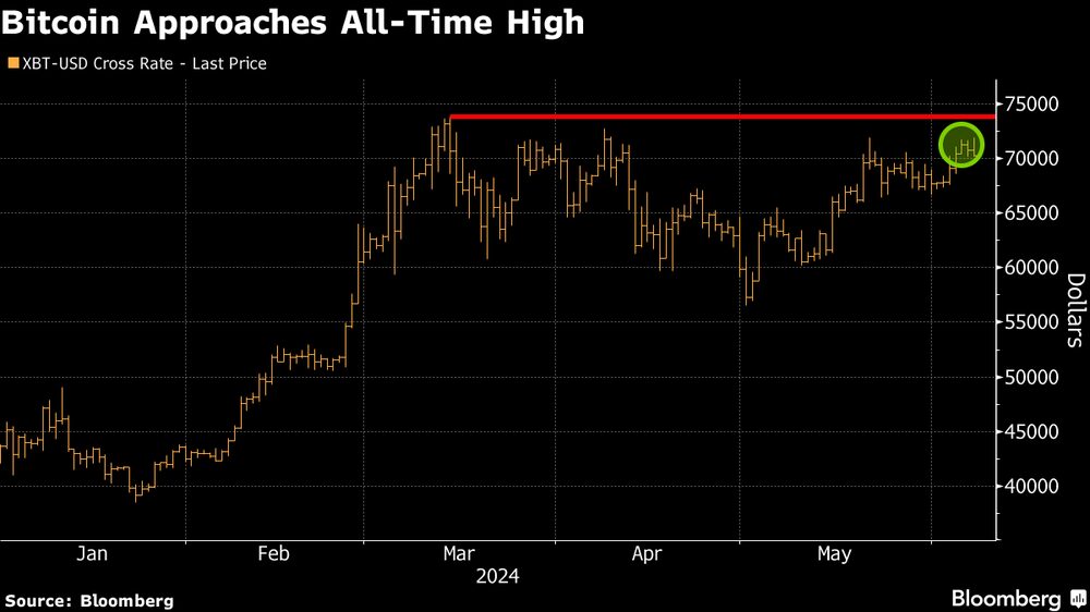 O bitcoin subiu esta semana, ficando perto de alcançar o recorde histórico de US$ 73.798 atingido em meados de março, em meio ao aumento da demanda por fundos negociados em bolsa (ETFs), que receberam a aprovação nos EUA neste ano.