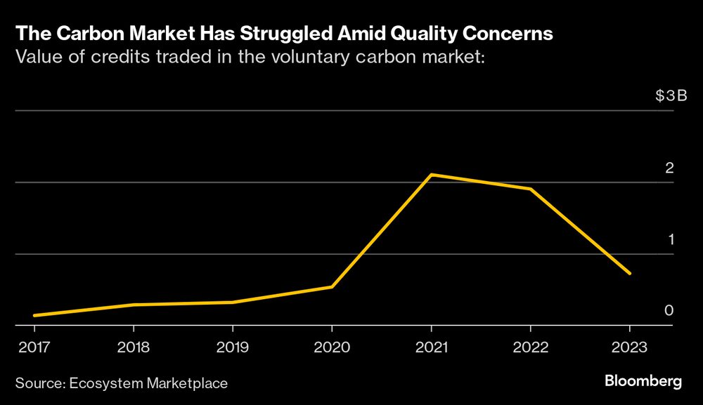 Os compradores se retraíram, e as compras voluntárias de créditos de carbono caíram de US$ 2 bilhões em 2021 para US$ 700 milhões no ano passado, de acordo com o Ecosystem Marketplace.