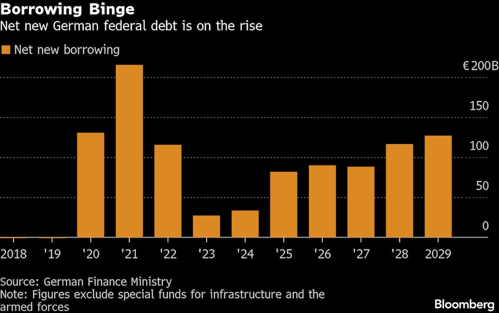 O enorme estímulo à infraestrutura lançado pelo chanceler começa a chegar à maior economia da Europa: € 24 bilhões já foram desembolsados até o início deste ano, com centenas de bilhões de euros ainda por vir. Um aumento dos gastos com defesa deve dar impulso adicional.