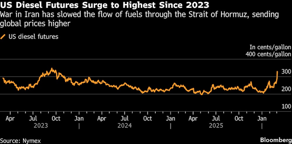 O diesel tem reagido de forma particularmente intensa ao conflito no Oriente Médio, em parte porque o Estreito de Ormuz é uma rota essencial para grandes volumes do combustível produzidos em refinarias da região.