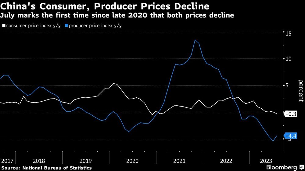 A China está passando por um raro período de queda nos preços, à medida que a demanda dos consumidores e das empresas enfraquece depois de uma explosão inicial no primeiro trimestre graças ao fim das restrições da pandemia. Uma queda prolongada no mercado imobiliário, a queda na demanda de exportação e os gastos moderados dos consumidores estão pesando sobre a recuperação da economia.