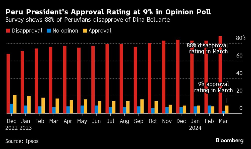 O congresso é tão impopular quanto Boluarte, com índices de aprovação de apenas 9% de acordo com uma pesquisa de março do Ipsos.
