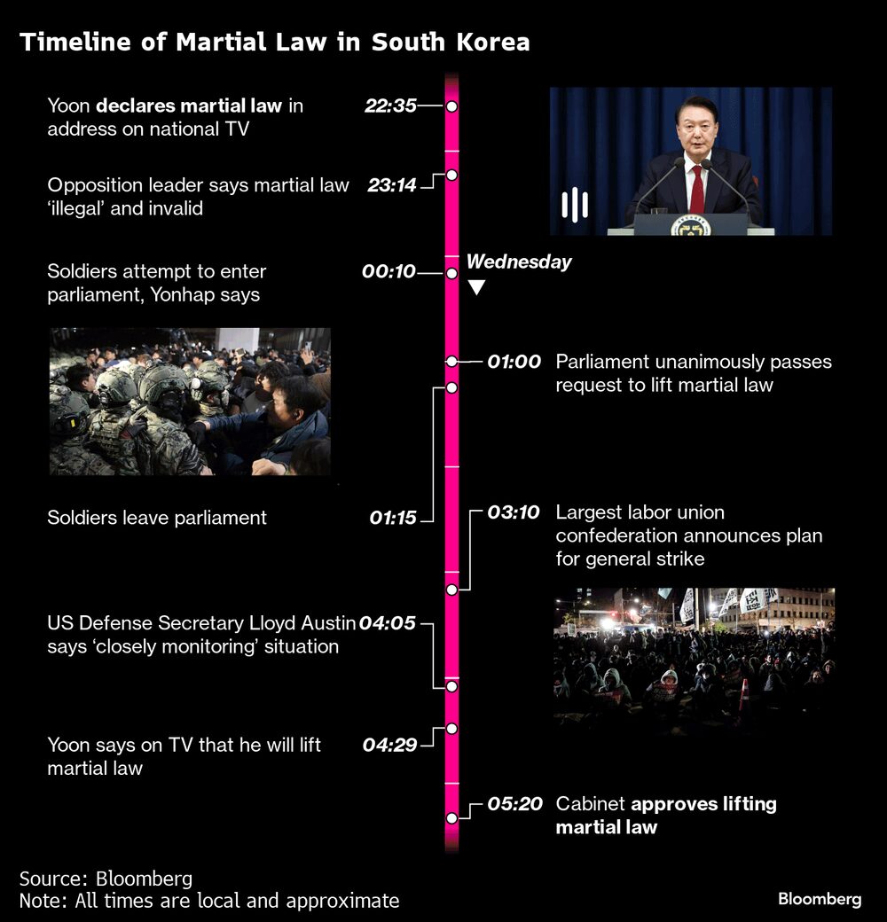 Em uma noite de reviravoltas, os legisladores se reuniram no parlamento para votar contra a lei marcial anunciada por Yoon em um discurso televisionado ao vivo no final da noite. Em seguida, Yoon fez outro discurso televisionado para dizer que aceitaria a exigência da Assembleia Nacional.