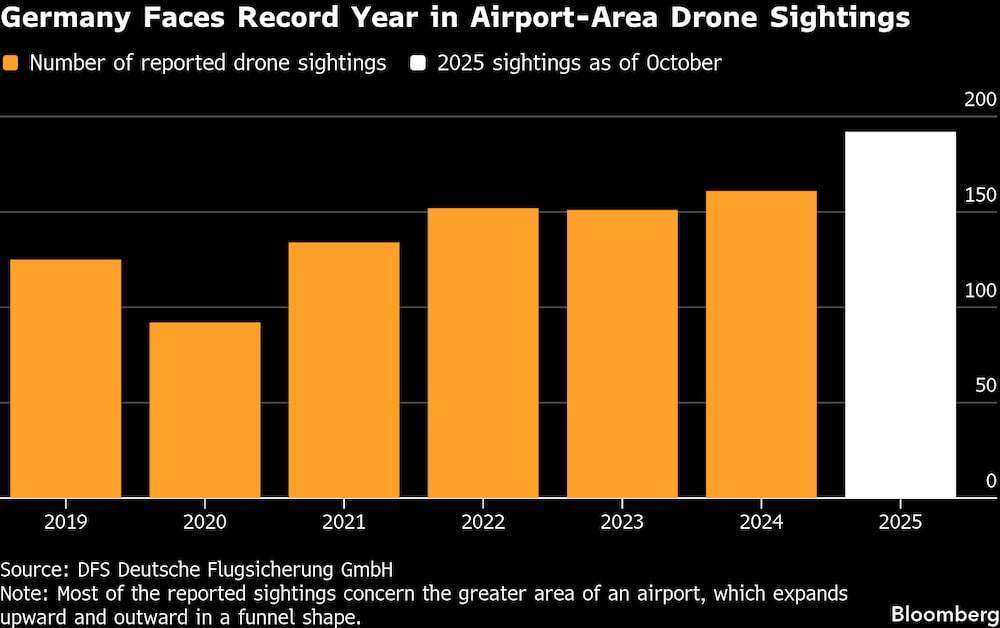 Embora nenhum drone tenha colidido com uma aeronave na Alemanha, mais de 190 avistamentos foram relatados nas proximidades de aeroportos até o final de outubro, colocando 2025 no caminho certo para um recorde.