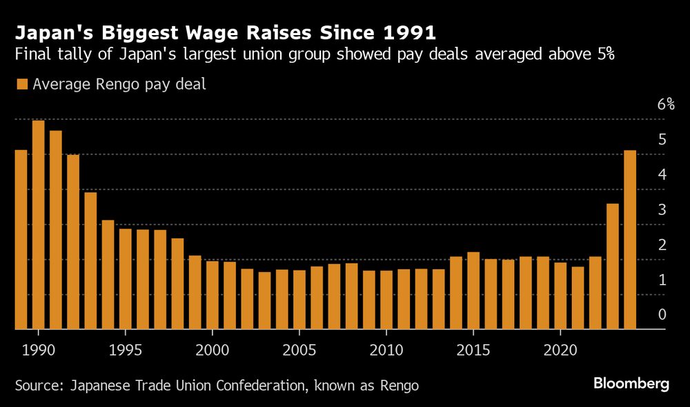 Bloomberg — As negociações salariais anuais do Japão terminaram com os maiores aumentos em mais de três décadas, de acordo com a contagem final do maior grupo sindical do país, confirmando uma tendência de alta nos salários buscada pelo banco central.