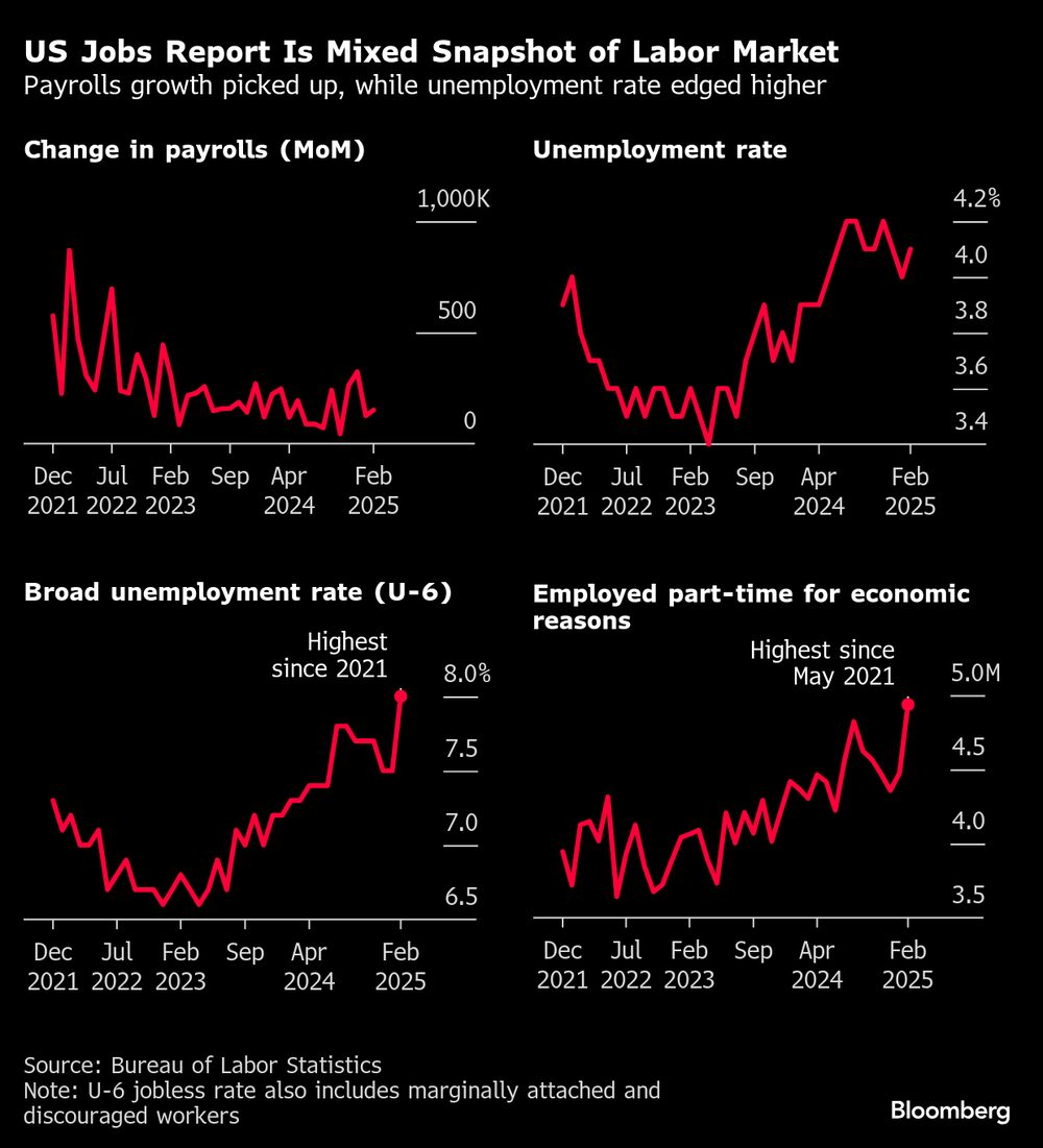 Bloomberg — O crescimento do emprego nos Estados Unidos se estabilizou no mês passado, ao mesmo tempo em que a taxa de desemprego aumentou - um retrato misto de um mercado de trabalho diante das rápidas mudanças nas políticas governamentais.