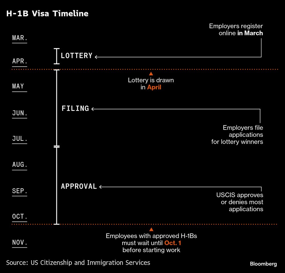 Todos os anos, os empregadores apresentam petições até março para uma loteria em abril, que disponibiliza 65.000 vistos, além de outros 20.000 para graduados em mestrado nos EUA.