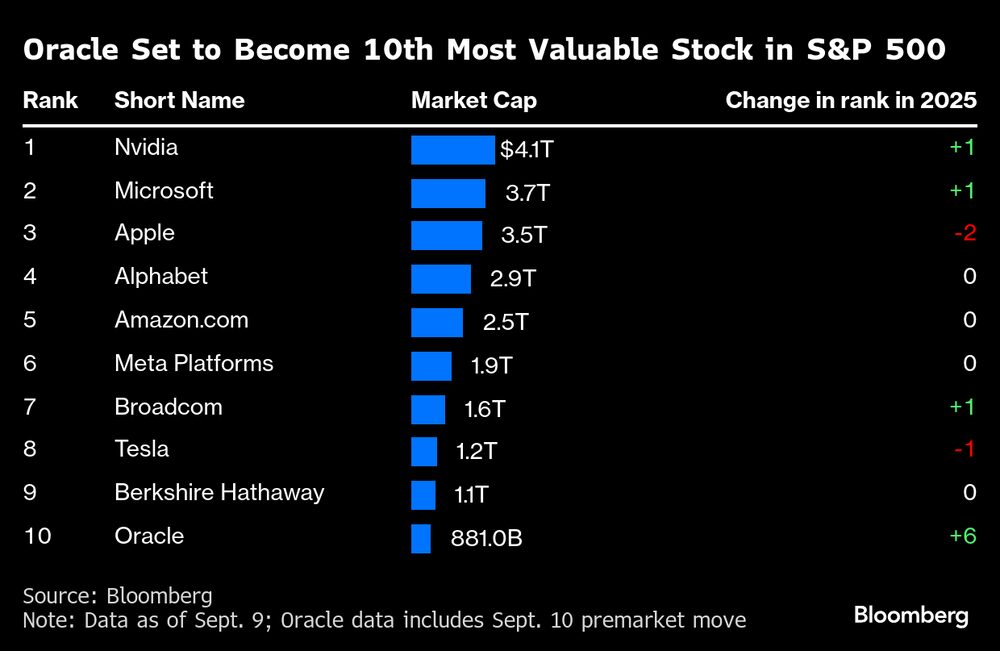 Bloomberg — A Oracle está prestes a ultrapassar ações como a do JPMorgan Chase para se tornar o décimo membro mais valioso do S&P 500, depois que uma previsão de negócios em nuvem surpreendente fez suas ações dispararem.