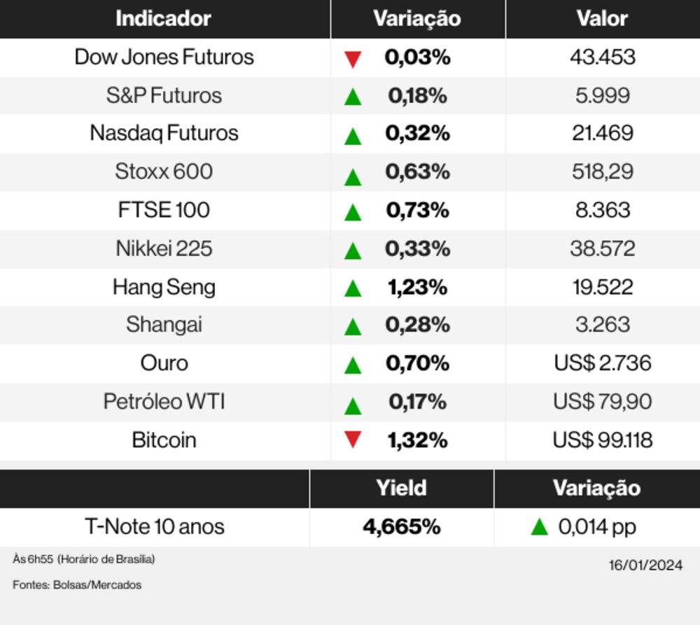 Os contratos futuros do Nasdaq 100, fortemente concentrado em tecnologia, subiram 0,6%, apoiados pelas notícias otimistas da TSMC, principal fornecedora de chips para a Apple e Nvidia Corp. Os futuros do S&P 500 também avançaram, o que sinaliza novos ganhos em Wall Street após o índice de referência subir 1,8% na quarta-feira, o melhor dia do mercado desde a eleição americana de novembro, após os dados de inflação.