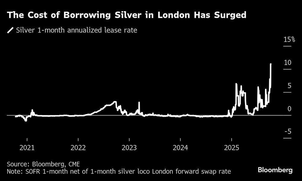 O mercado de prata em Londres também se restringiu a um nível quase sem precedentes, com custos de empréstimo altíssimos para o metal. Este ano, o temor de que os EUA pudessem cobrar tarifas sobre a prata estimulou uma corrida para enviar o metal para os EUA, reduzindo os estoques em Londres e a quantidade de material disponível para empréstimo.