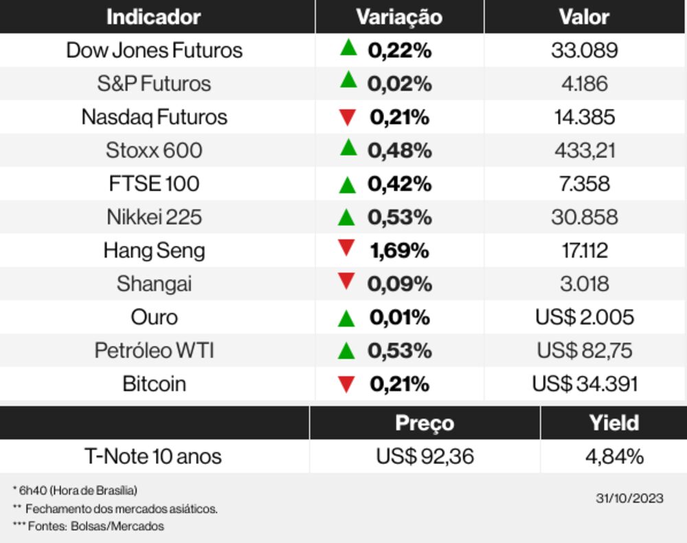 📈 O vaivém dos ativos. Os contratos futuros de índices dos EUA operavam quase todos com valorização discreta. As bolsas europeias subiam, ajudadas pela alta das ações da AB InBev e da Stellantis após divulgação de resultados. Na Ásia, o fechamento foi majoritariamente negativo, embora o índice japonês Nikkei tenha fechado com ganhos. Em outros mercados, o prêmio de risco do título de 10 anos dos EUA, em queda, era de 4,84%. No mercado cambial, o euro e a libra esterlina se apreciavam frente ao dólar, assim como o iene. O ouro operava perto da estabilidade, acima de US$2.000, e os contratos de petróleo bruto WTI subiam, cotados ao redor de US$82 por barril.