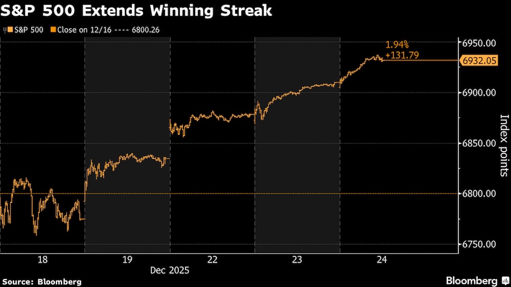 Bloomberg — As ações americanas encerraram nesta quarta-feira (24) a mais longa sequência de ganhos desde novembro, em um pregão encurtado pelas festas de fim de ano e de baixa liquidez, enquanto investidores analisaram dados do mercado de trabalho em busca de novos sinais sobre a trajetória dos juros do Federal Reserve.