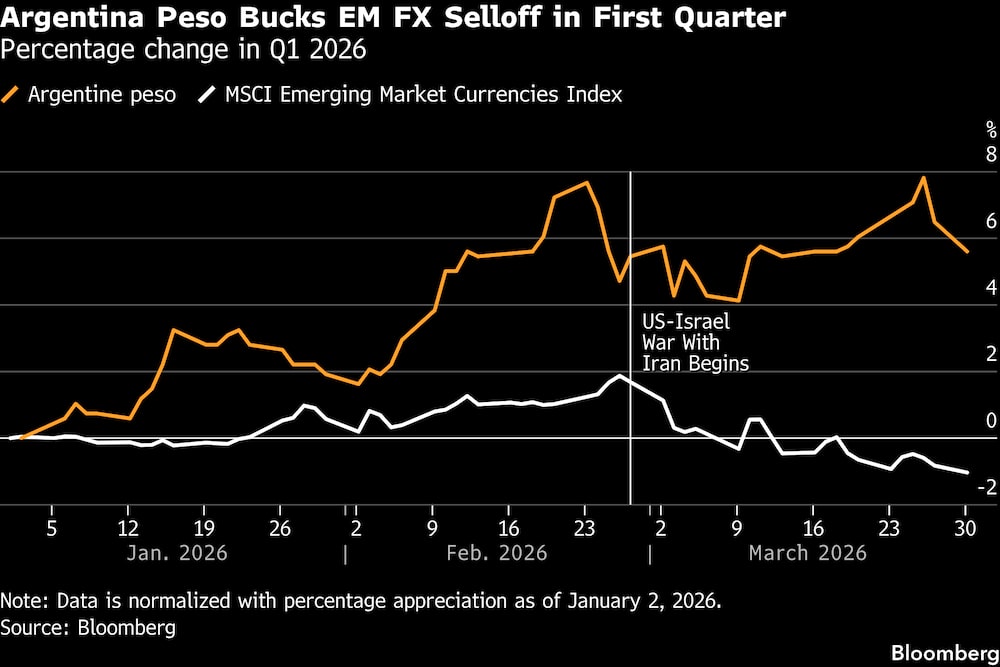 O peso foi uma das duas moedas de países em desenvolvimento a ganhar força em relação ao dólar em março, quando o índice de retorno total do MSCI para moedas emergentes teve sua pior queda mensal desde 2022, uma vez que os investidores reavaliaram as probabilidades de cortes nas taxas de juros e custos mais altos de energia desde o início do conflito.
