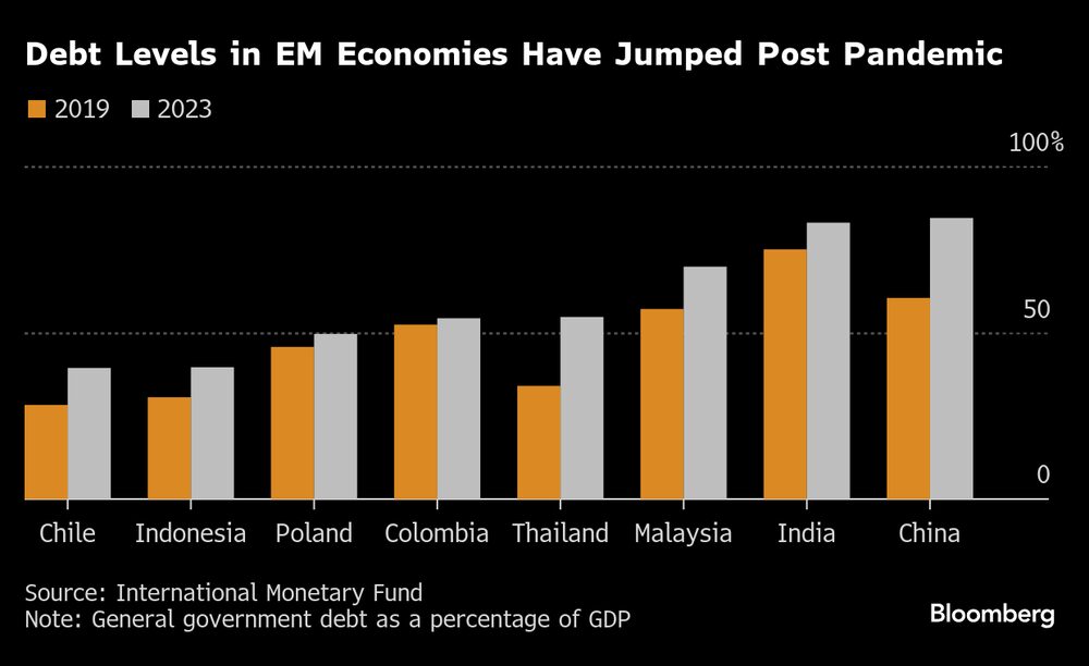 A relação entre a dívida e o produto interno bruto da Tailândia aumentou de 34% em 2019 para 55% em 2023, de acordo com os dados mais recentes do Fundo Monetário Internacional. China, Chile, Colômbia e Polônia também estão observando uma tendência semelhante.