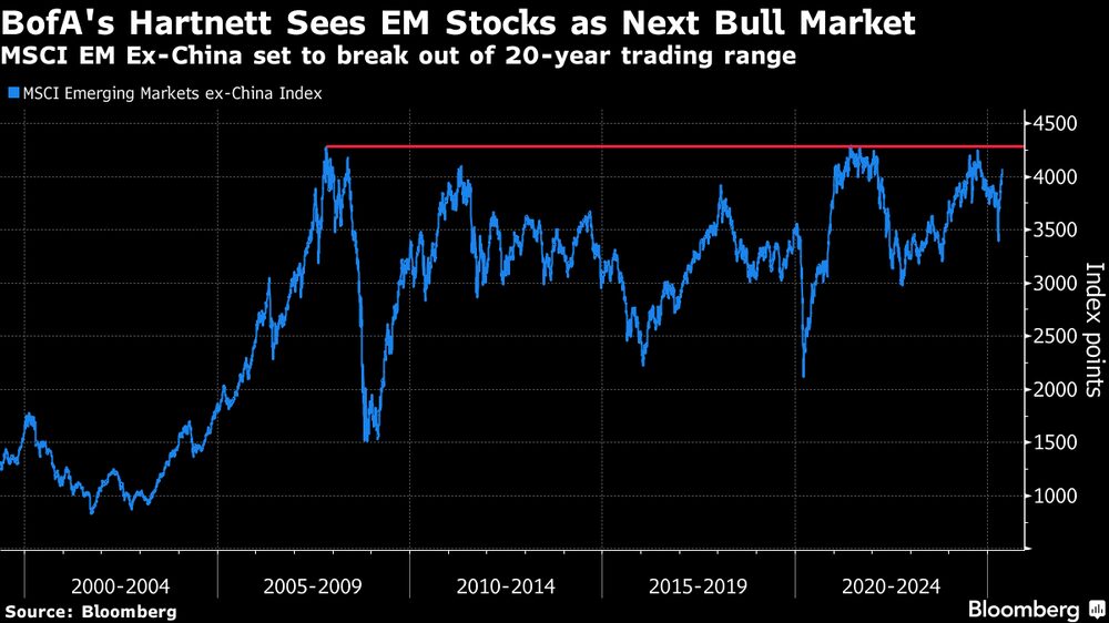 O índice MSCI de mercados emergentes, excluindo a China, subiu 20% desde as mínimas de abril e está prestes a romper uma faixa de negociação de 20 anos.