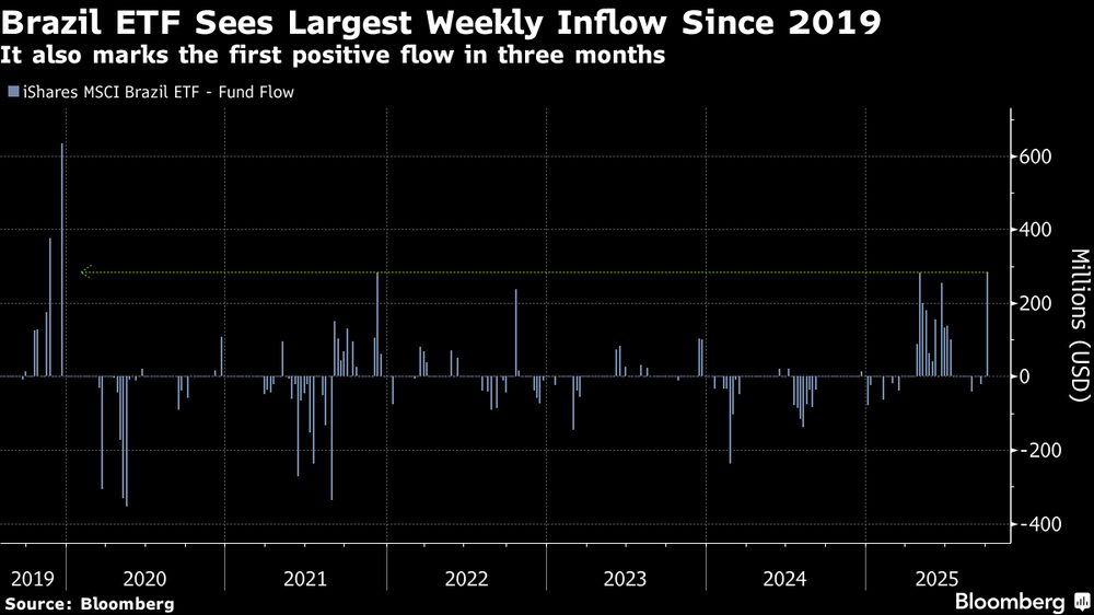 Investidores aplicaram mais de US$ 285 milhões no iShares MSCI Brazil ETF (EWZ), um fundo de US$ 5,85 bilhões. Foi a primeira entrada líquida positiva semanal desde que o presidente americano Donald Trump anunciou tarifas de 50% sobre produtos brasileiros, em 10 de julho. Também representa a maior entrada semanal no ETF desde dezembro de 2019.