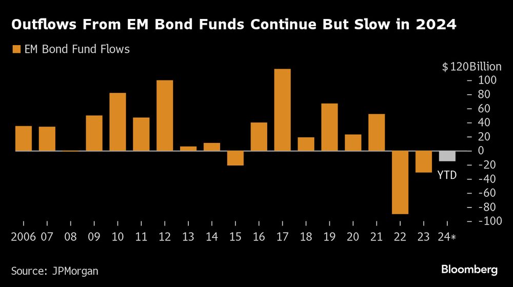 Os fundos de títulos de mercados emergentes se esforçaram para atrair fluxos de entrada em meio à perspectiva de taxas mais altas por mais tempo nos Estados Unidos, de modo que registraram apenas nove semanas positivas - com ingresso líquido de capital - neste ano, de acordo com dados do JPMorgan.
