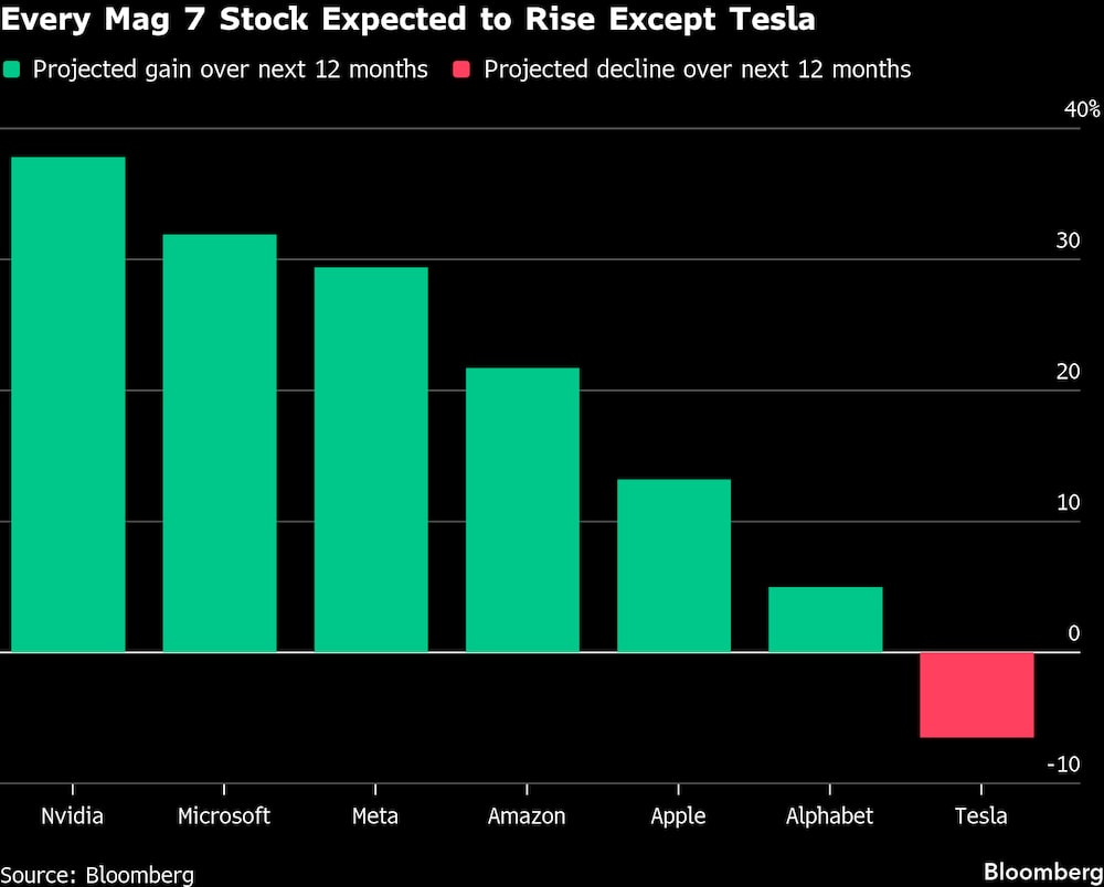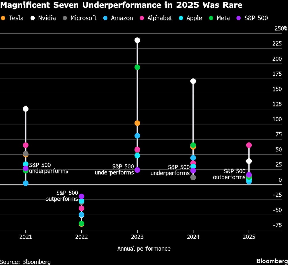 Embora o Bloomberg Magnificent 7 Index tenha subido 25% em 2025, em comparação com 16% do S&P 500, isso se deveu apenas aos enormes ganhos da Alphabet e da Nvidia.