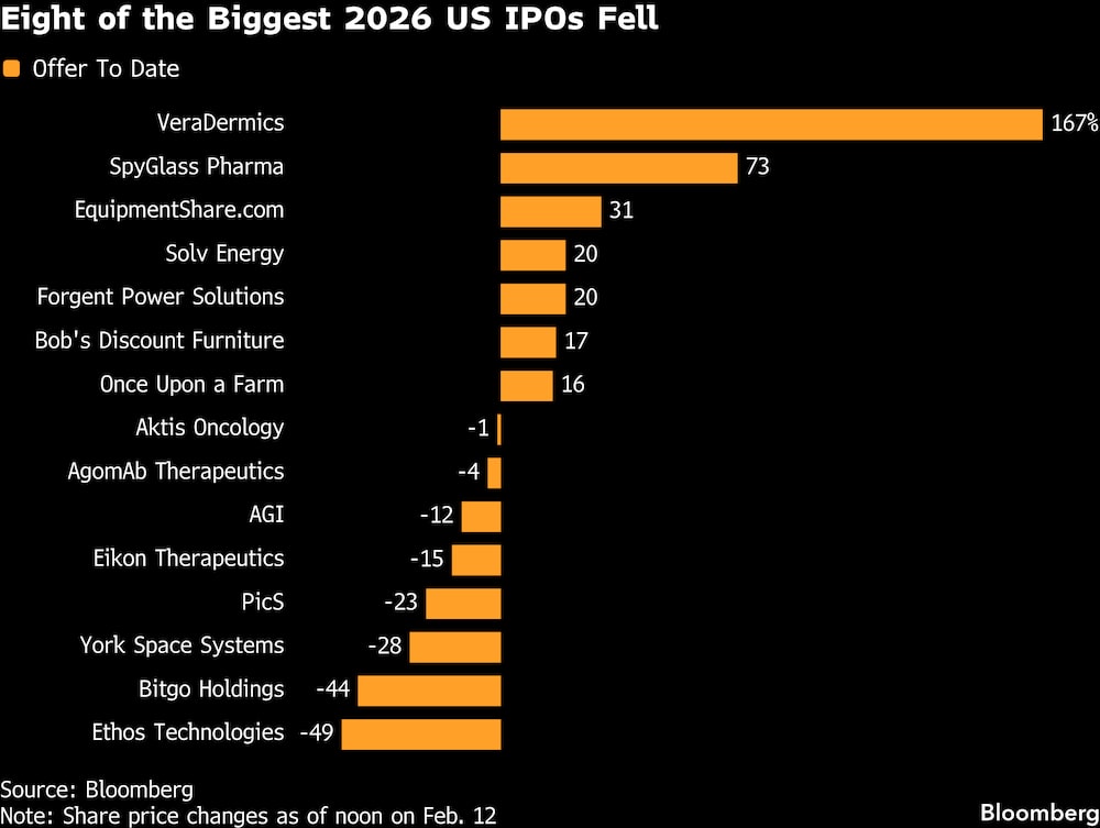 Investidores que compraram ações de empresas de tecnologia em IPOs recentes agora tentam absorver as perdas, à medida que companhias listadas dos setores de software e serviços financeiros sofrem pressão diante das incertezas relacionadas à inteligência artificial.