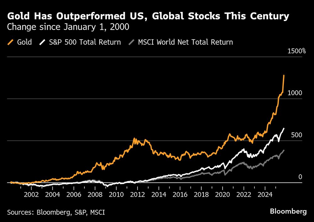 O metal atinge um marco histórico, depois de ter sido negociado abaixo de US$ 2.000 há apenas dois anos — e agora acumula retornos que superam amplamente os do mercado acionário neste século.