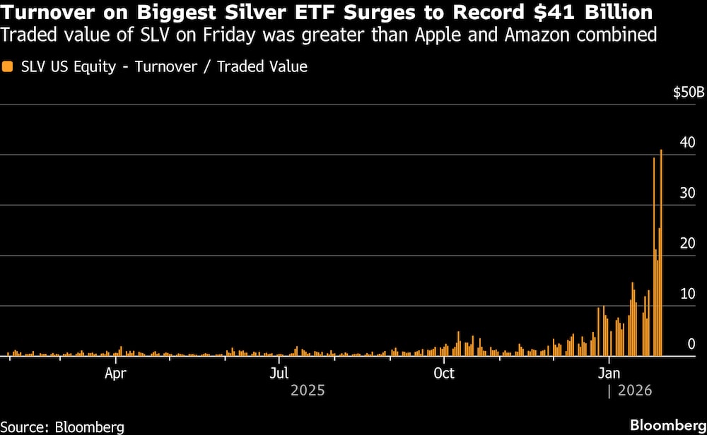 Na sexta-feira, o iShares Silver Trust, o maior fundo negociado em bolsa lastreado em prata, conhecido pelo ticker SLV, registrou mais de US$ 40 bilhões em volume negociado. Isso o colocou entre os ativos mais negociados do planeta — quando, poucos meses antes, raramente ultrapassava US$ 2 bilhões.